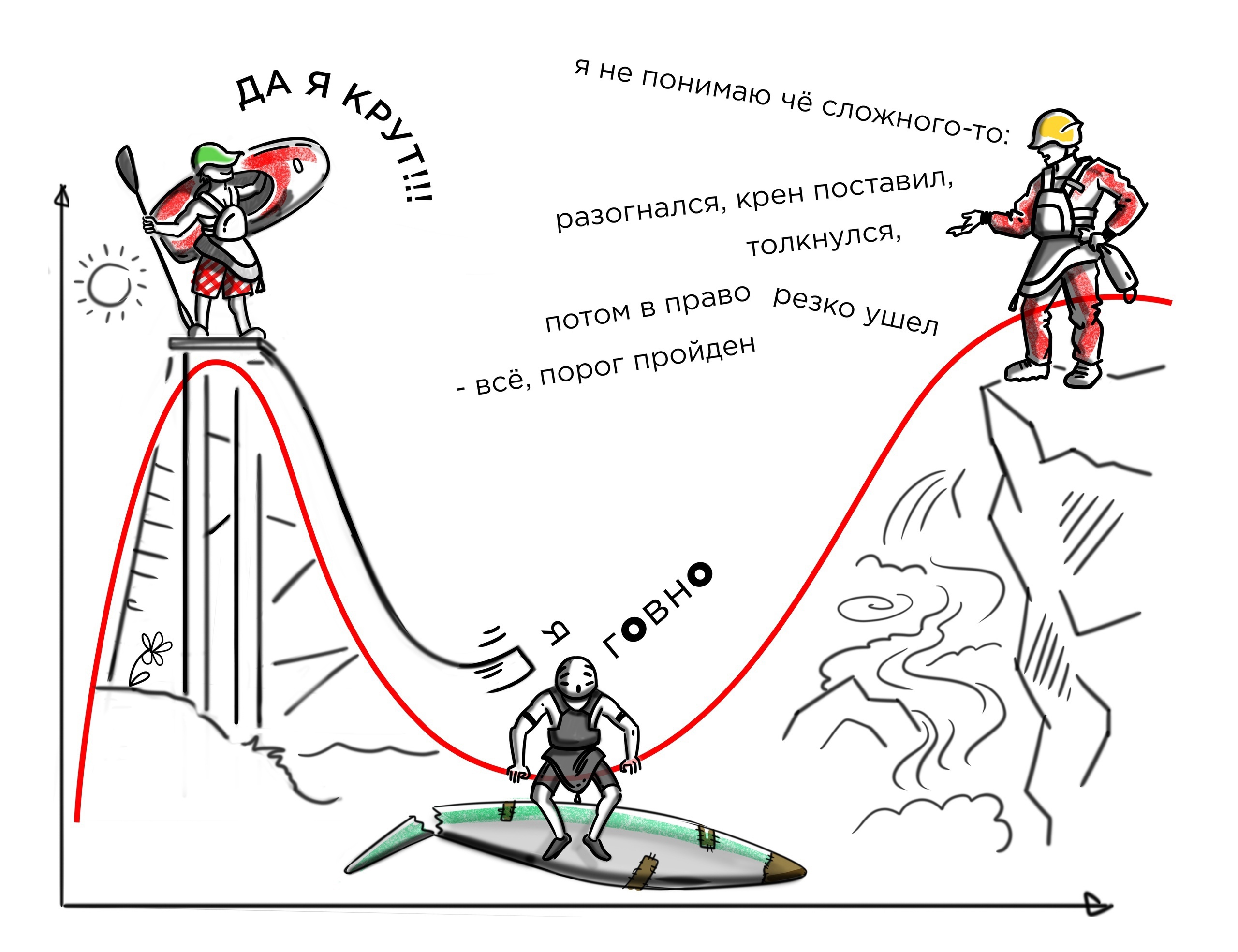Сейчас я отчётливо понимаю, что свою Гору Глупости я прошел где-то на второй год обучения. Тогда, стабильное умение вставать и слепая вера в то что продавит (и продавливало ведь, что характерно) вознесли мою уверенность в себе до небес. К счастью, каякинг это спорт с высокой и быстрой обратной связью и всё вскоре встало в голове на свои места.